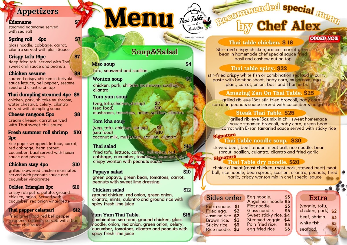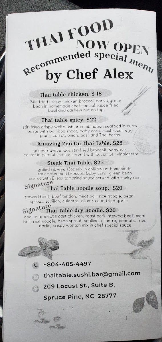 Welcome to Thai Table & Sushi Bar, a culinary gem nestled in Spruce Pine, NC. This vibrant restaurant invites you to indulge in authentic Thai and exquisite sushi offerings. From the moment you step inside, you're enveloped in a warm atmosphere complemented by friendly service. The menu is a delightful mix of flavors, featuring popular appetizers like Thai Dumplings and Thai Pepper Calamari. For sushi enthusiasts, the Nigiri selection, including Crab and Unagi, is sure to impress.
